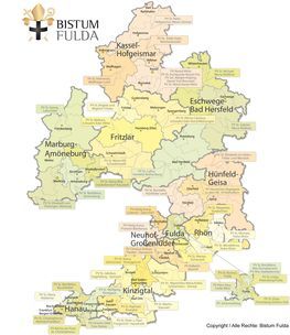 Die Karte ist urheberrechtlich geschützt, inklusive einzelner Kartenausschnitte sowie Logo und Schriftzug. Kopien auch von einzelnen Teilen in jedweder Kartenform dürfen nur nach schriftlicher Genehmigung durch das Bistum Fulda erstellt werden. Die unberechtigte Verwendung ist strafbar und kann zu Schadensersatzforderungen durch das Bistum Fulda führen. Das Bistum Fulda räumt den Pfarrgemeinden der Diözese und den kirchlichen Einrichtungen ein eingeschränktes und nicht ausschließliches Nutzungsrecht ein, das allerdings nicht auf andere Personen weiter übertragbar ist. Das Nutzungsrecht beschränkt sich auf den Ausdruck und Aushang der Karte den Räumen der Pfarrgemeinde sowie auf die Verwendung im Pfarrbrief.
