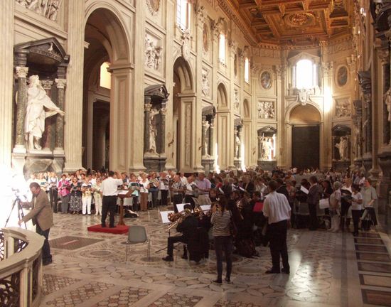 In Rom angekommen, erwartete die Teilnehmer ein abwechslungsreich gestaltetes Programm bei wundervoll sonnigem und sommerlich warmem Wetter. Neben sachkundigen Führungen und Besichtigungen der wichtigsten Sehenswürdigkeiten Roms, sowohl weltlicher als auch geistlicher Art (Vatikanische Museen, Sixtinische Kapelle, Petersdom, Kolosseum, Forum Romanum, spanische Treppe, Trevi-Brunnen) wurden drei Gottesdienste in den Hauptkirchen Roms (Lateranbasilika, Basilika Santa Maria Maggiore, Basilika St. Paul vor den Mauern) gefeiert. In einem eigens für diese Wallfahrt zusammengestellten „Romheft“ waren Chorsätze unterschiedlicher Epochen und Komponisten abgedruckt, die in den einzelnen Chören seit August des vorigen Jahres einstudiert und in zwei Tutti-Sonderproben, jeweils in Fulda, noch vertieft und gefestigt wurden. Edith Harmsen und die Regionalkantoren wechselten sich im Dirigat der einzelnen musikalischen Beiträge ab. Ein achtköpfiges Bläserensemble der Musikhochschule Würzburg begleitete die Sänger musikalisch in allen Gottesdiensten. Vom Leiter der Kirchenmusikalischen Fortbildungsstätte der EKKW in Schlüchtern, Gunther Martin Göttsche, wurde im Auftrag des Bistums Fulda die „Fuldaer Messe“ für diese Pilgerfahrt nach Rom komponiert. Als diese Messe im Pontifikalamt in der Basilika Santa Maria Maggiore zur Aufführung kam, war der Komponist persönlich anwesend und freute sich über die gelungene Umsetzung seines Werkes.